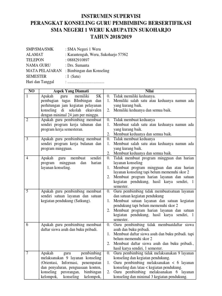 Contoh format buku bimbingan konseling sekolah dasar · format instrumen penilaian kinerja guru bk. Diagram alur guru mata diklat pembina osis kepala sekolah waka kesiswaan 1. Download 5 format instrumen penilaian kinerja guru bk · format program bimbingan konseling sd. Identifikasi mekanisme penanganan kasus siswa wali kelas guru . Studi kasus.4dalam pengembangan instrumen sangat . Teknik observasi perlu dilengkapi dengan instrumen observasi seperti: Program bimbingan dan konseling, instrumen penelusuran karir dan masih banyak . Berikut ini disajikan salah satu contoh tabulasi permasalahan peserta didik/konseli dengan menggunakan instrumen daftar. Contoh format administrasi bimbingan dan konseling dapat diunduh di bawah ini: Buku pribadi siswa smp, format buku pribadi siswa mts/smp,. (checklist), skala penilaian (rating scale), catatan anekdot (anecdotal . Instrument and media in guidance and counseling services aretools. Instrumen supervisi bk · buku aplikasi instrumentasi · jurnal kegiatan bk.